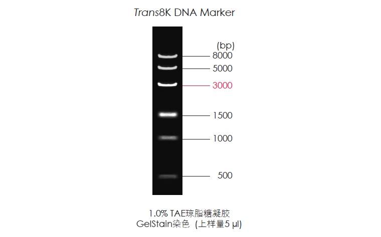 Trans8K DNA Marker由6條線狀雙鏈DNA條帶組成適用于瓊脂糖凝膠電泳中DNA條帶的分析,不建議用于聚丙烯酰胺凝膠電泳。本產(chǎn)品為即用型產(chǎn)品,已含有1×Loading Buffer,可根據(jù)實驗需要,直接取5 μl電泳,使用方便,電泳圖像清晰。其中3000 bp條帶濃度為100 ng/5 μl,顯示亮帶,其余條帶濃度均為50 ng/5 μl。便于準確判斷目的產(chǎn)物DNA的量。