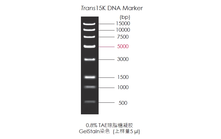Trans15K DNA Marker由8條線狀雙鏈DNA條帶組成,適用于瓊脂糖凝膠電泳中DNA條帶的分析,不建議用于聚丙烯酰胺凝膠電泳。本產(chǎn)品為即用型產(chǎn)品,已含有1×Loading Buffer,可根據(jù)實驗需要,直接取5 μl電泳,使用方便,電泳圖像清晰。其中5000 bp條帶濃度為100 ng/5 μl,顯示亮帶,其余條帶濃度均為50 ng/5 μl。