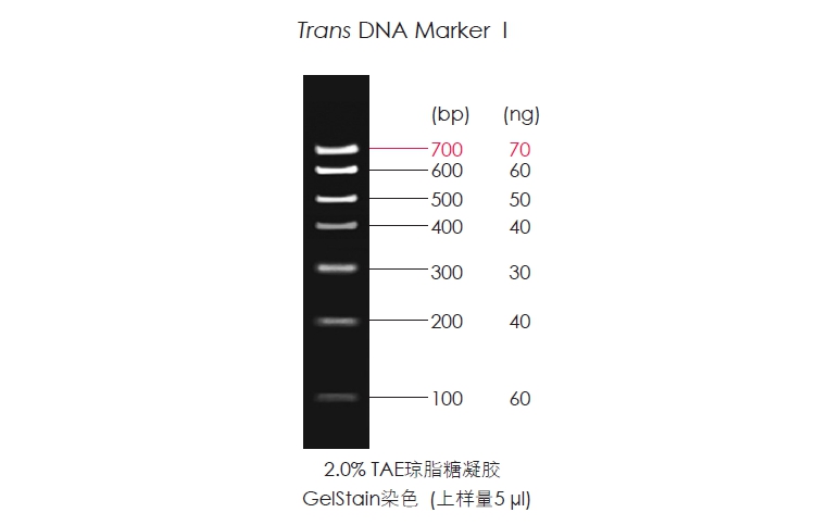 Trans DNA Maker I是由7條線狀雙鏈DNA條帶組成,適用于瓊脂糖凝膠電泳中DNA條帶的分析,不建議用于聚丙烯酰胺凝膠電泳。本產(chǎn)品為即用型產(chǎn)品,已含有1×Loading Buffer,可根據(jù)實(shí)驗(yàn)需要,直接取5 μl電泳,使用方便,電泳圖像清晰。便于準(zhǔn)確判斷目的產(chǎn)物DNA的量。