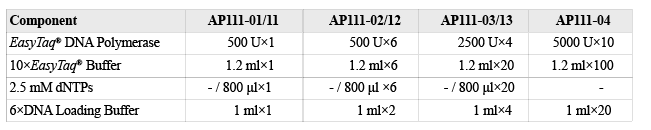 EasyTaq? DNA Polymerase是從克隆有Thermu aquaticus DNA Polymerase基因的載體,在大腸桿菌中經誘導表達、分離純化而成,其分子量為94 kDa。EasyTaq? DNA Polymerase具有5'→3' DNA聚合酶活性和5'→3'外切酶活性,無3'-5'外切酶活性。其PCR產物不適用于聚丙烯酰胺凝膠電泳。