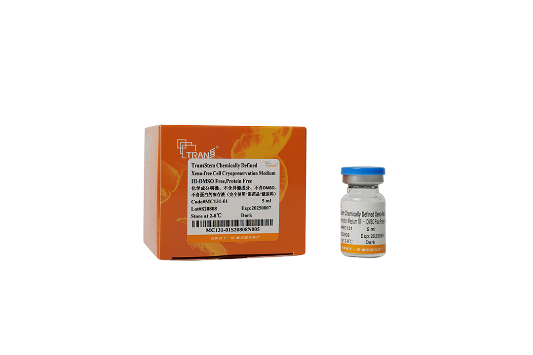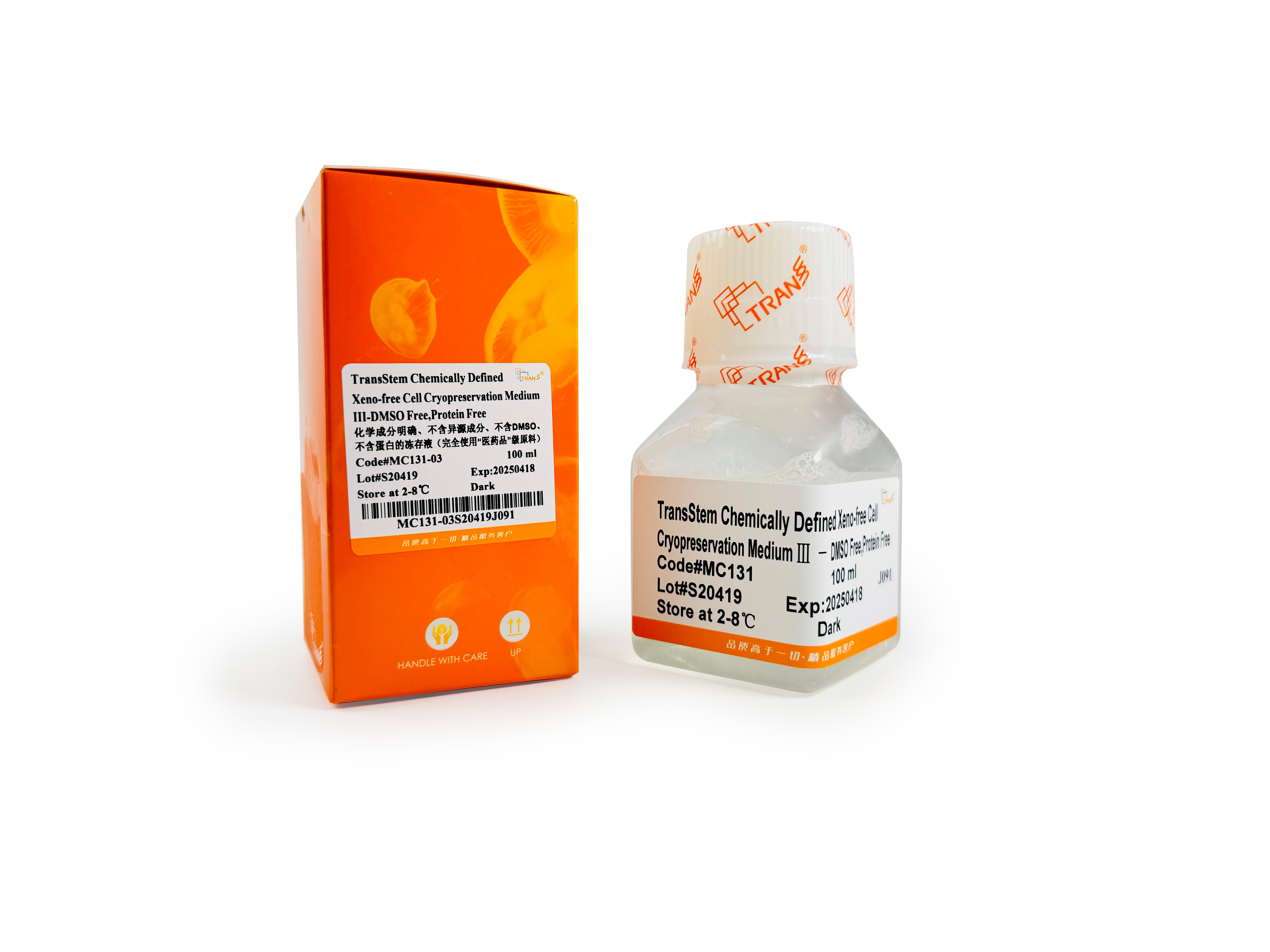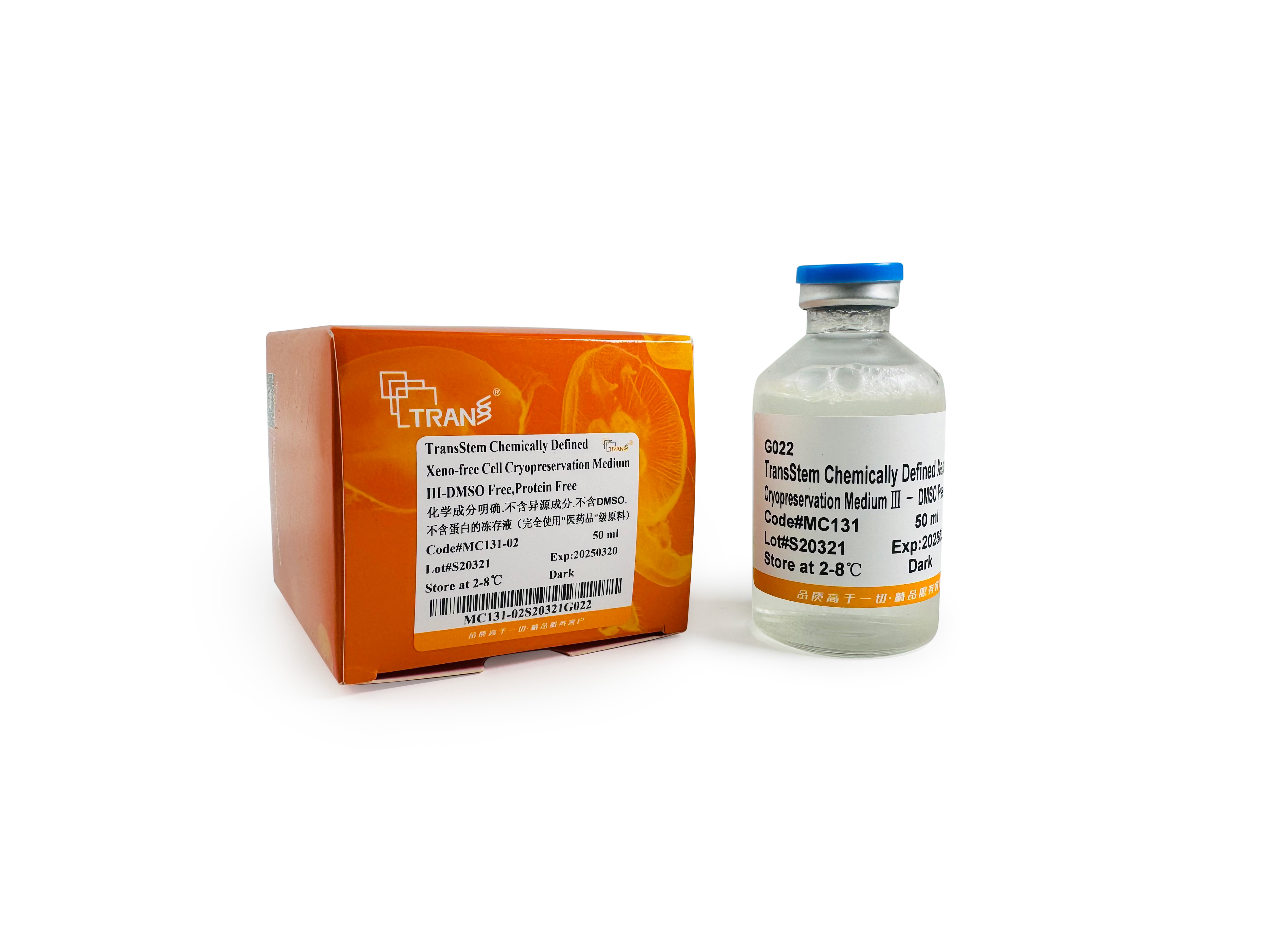 TransStem? Chemically Defined Xeno-free Cell Cryopreservation Medium III—DMSO Free,Protein Free 是一種化學成分明確、無動物源性成分、不含二甲基亞砜(DMSO) 、不含蛋白成分、完全使用“醫(yī)藥品”級原料的即用型細胞凍存液。該產品已完成毒性實驗,可用作細胞藥物的藥用輔料,通用于各種細胞類型,包括間充質干細胞,淋巴細胞等。該產品穩(wěn)定性好,能有效提高各類細胞復蘇活率。使用該產品凍存細胞可直接存放于-80℃冰箱凍存,無需經過費時的程序降溫過程。