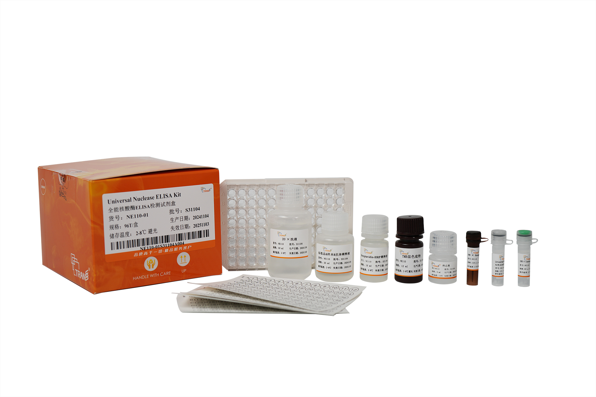 本試劑盒采用雙抗體夾心ELISA法定量測(cè)定生物制品中Universal Nuclease的殘留量。本試劑盒采用高親和力的Universal Nuclease抗體預(yù)包被酶標(biāo)板,將標(biāo)準(zhǔn)品/待測(cè)樣本和生物素標(biāo)記的抗Universal Nuclease檢測(cè)抗體同步加入微板孔中,經(jīng)過(guò)孵育后樣本中存在的Universal Nuclease會(huì)與酶標(biāo)板上的預(yù)包被抗體及檢測(cè)抗體特異性結(jié)合。洗滌去除未結(jié)合物后,將辣根過(guò)氧化物酶標(biāo)記的鏈霉親和素(Streptavidin-HRP)加至微孔板中并孵育,通過(guò)檢測(cè)抗體上的生物素和鏈霉親和素發(fā)生的高強(qiáng)度非共價(jià)結(jié)合,形成“包被抗體- Universal Nuclease蛋白-檢測(cè)抗體-Streptavidin-HRP”免疫復(fù)合物。再次洗滌后,將顯色底物TMB加至微板孔中,HRP會(huì)催化TMB底物生成藍(lán)色產(chǎn)物,顏色反應(yīng)的深淺將與樣本中Universal Nuclease的濃度成正相關(guān)。而后加入終止液終止反應(yīng),在450 nm波長(zhǎng)(參考波長(zhǎng)570 - 630 nm)處測(cè)定吸光度值。通過(guò)繪制標(biāo)準(zhǔn)曲線,由樣本吸光度值可計(jì)算出樣本中所含Universal Nuclease濃度。本試劑盒特異性強(qiáng)、檢測(cè)靈敏度高,同時(shí)操作更加便捷。