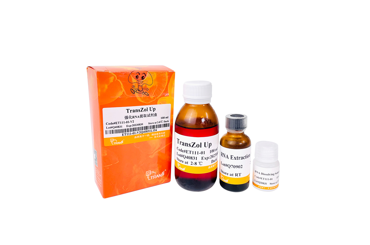 TransZol Up利用異硫氰酸胍裂解細(xì)胞。在樣品的裂解過程中,TransZol Up可保持RNA完整性,加入RNA Extraction Agent后,溶液分為無色水相和粉紅色有機(jī)相,RNA在水相,用異丙醇可沉淀回收RNA,有機(jī)相用異丙醇可回收蛋白質(zhì)。TransZol Up與其它總RNA提取試劑相比,裂解能力強(qiáng)、速度快,RNA的提取量與純度更高。適用于快速提取多種組織和細(xì)胞中的總RNA。