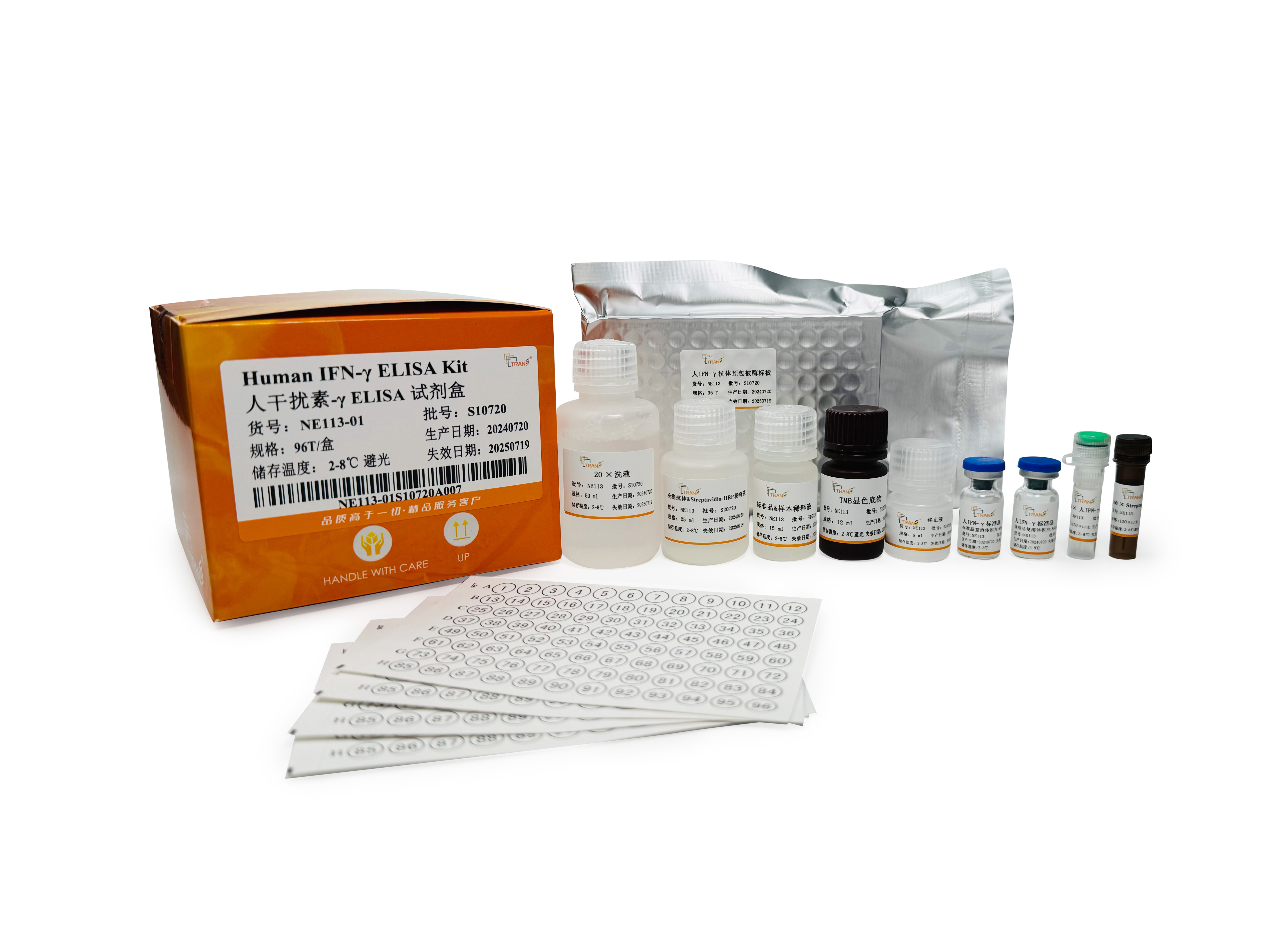 本試劑盒采用雙抗體夾心ELISA法定量測(cè)定人血清、血漿和細(xì)胞培養(yǎng)上清中的IFN-γ含量。本試劑盒采用高親和力的抗人IFN-γ抗體預(yù)包被酶標(biāo)板,將標(biāo)準(zhǔn)品/待測(cè)樣本和生物素標(biāo)記的抗人IFN-γ檢測(cè)抗體同步加入微板孔中,經(jīng)過孵育后樣本中存在的IFN-γ會(huì)與酶標(biāo)板上的預(yù)包被抗體和檢測(cè)抗體特異性結(jié)合。洗滌去除未結(jié)合物后,將辣根過氧化物酶標(biāo)記的鏈霉親和素(Streptavidin-HRP)加至微孔板中并孵育,通過檢測(cè)抗體上的生物素和鏈霉親和素發(fā)生的高強(qiáng)度非共價(jià)結(jié)合,形成“包被抗體-人IFN-γ蛋白-檢測(cè)抗體-Streptavidin-HRP”免疫復(fù)合物。再次洗滌后,將顯色底物TMB加至微板孔中,HRP會(huì)催化TMB底物生成藍(lán)色產(chǎn)物,顏色反應(yīng)的深淺將與樣本中IFN-γ的濃度成正相關(guān)。而后加入終止液終止反應(yīng),在450 nm波長(參考波長570 - 630 nm)處測(cè)定吸光度值。通過繪制標(biāo)準(zhǔn)曲線,由樣本吸光度值可計(jì)算出樣本中所含IFN-γ濃度。本試劑盒特異性強(qiáng)、檢測(cè)靈敏度高,同時(shí)操作更加便捷。