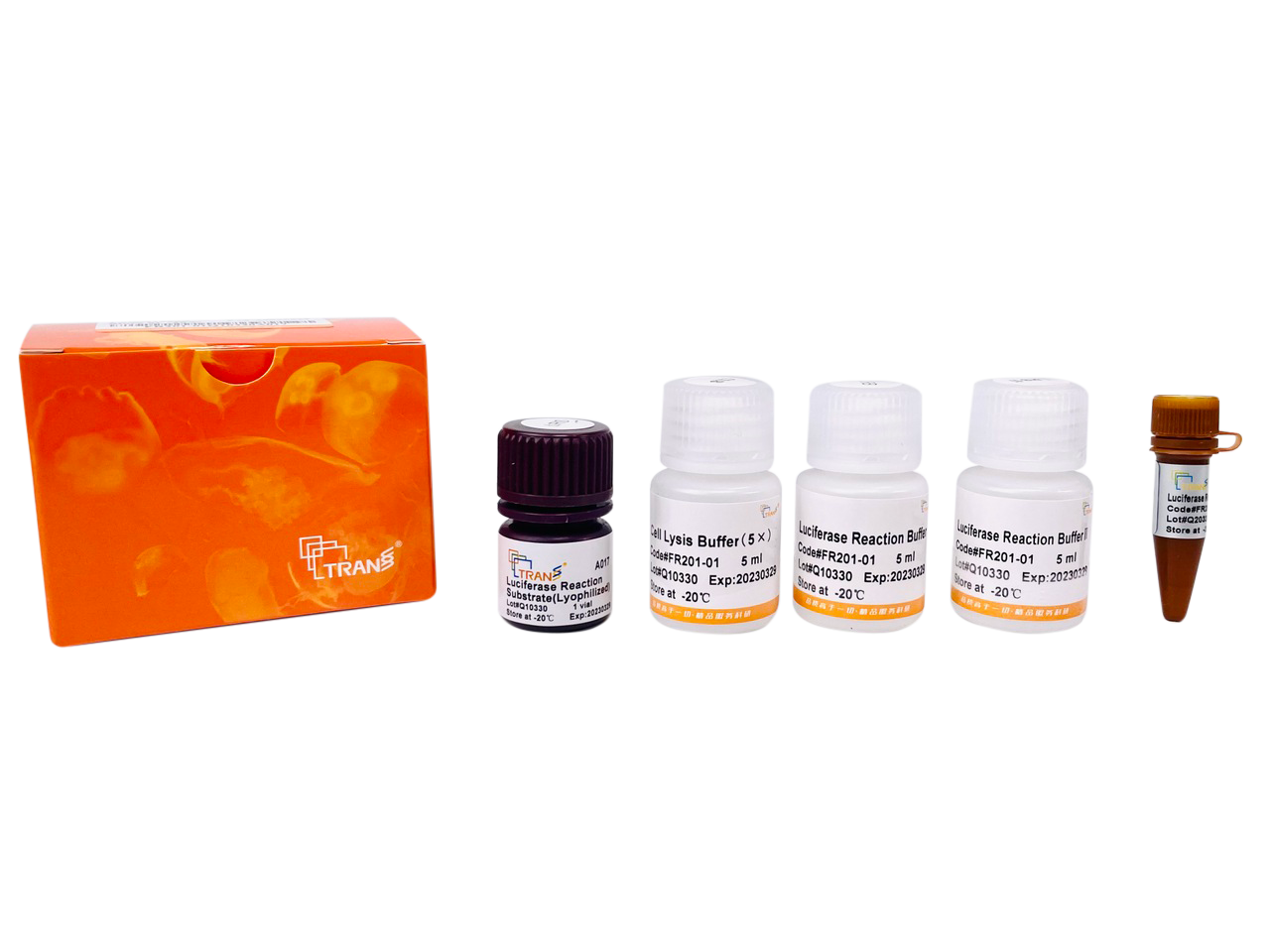 螢火蟲熒光素酶 (firefly luciferase)和海腎螢光素酶(Renilla luciferase)可分別催化熒光素 (luciferin)或腔腸素 (coelenterazine) 氧化形成oxyluciferin或coelenteramide ,并在此過(guò)程中產(chǎn)生生物熒光。TransDetect? Double-Luciferase Reporter Assay Kit首先以熒光素為底物檢測(cè)螢火蟲熒光素酶報(bào)告基因的活性,之后在淬滅該熒光反應(yīng)的同時(shí),以腔腸素為底物檢測(cè)海腎熒光素酶報(bào)告基因的活性,具有檢測(cè)迅速、靈敏度高、檢測(cè)范圍廣、無(wú)細(xì)胞內(nèi)源活性干擾等特點(diǎn)。