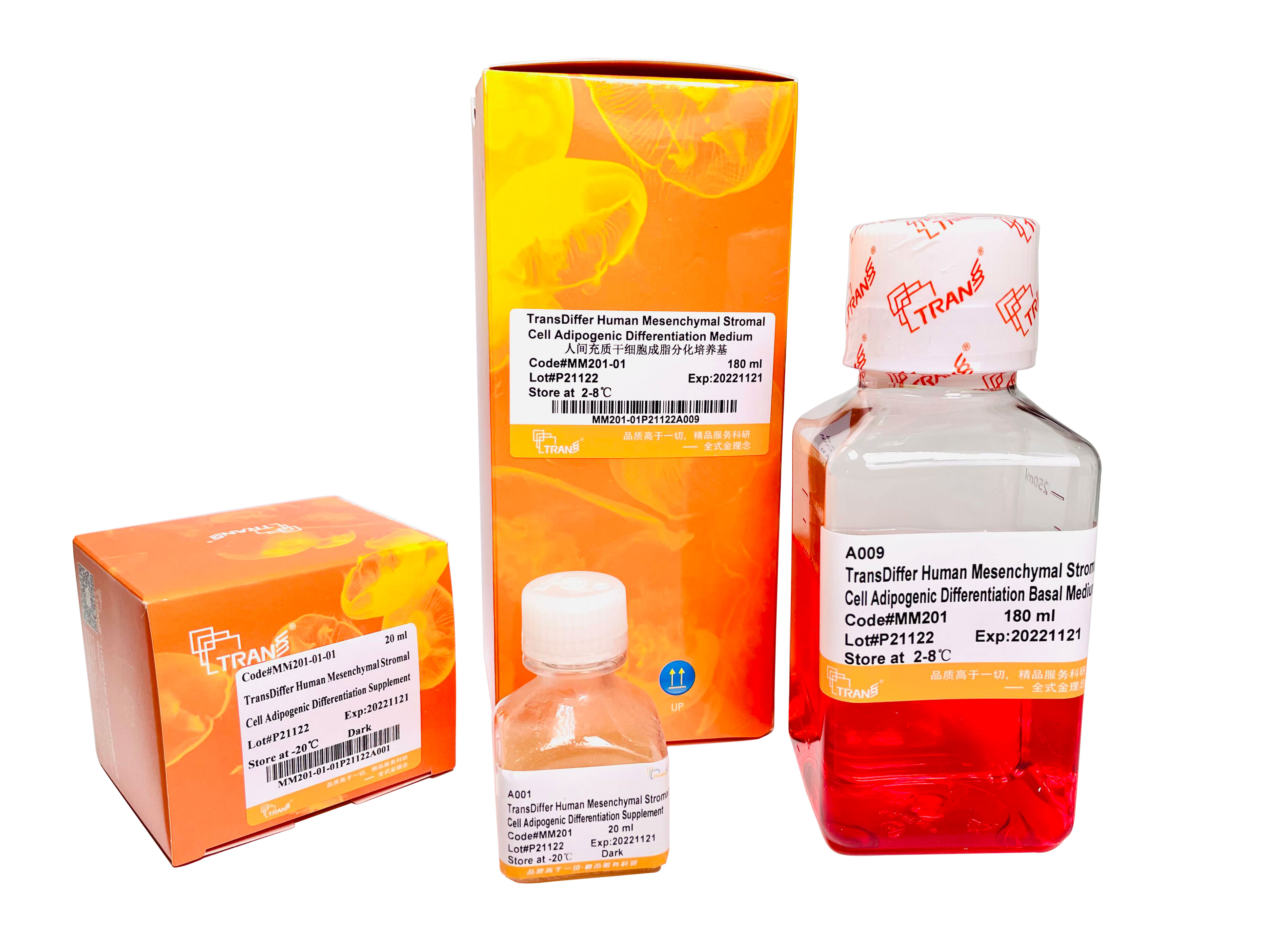 TransDiffer? Human Mesenchymal Stromal Cell Adipogenic Differentiation Medium是一種含血清的完全培養(yǎng)基,適用于將人間充質(zhì)干細(xì)胞(Human Mesenchymal Stromal Cells, MSCs)分化為脂肪細(xì)胞。本產(chǎn)品普適性強(qiáng),適用于多種培養(yǎng)體系(含血清及無血清)培養(yǎng)的不同來源(人多能性干細(xì)胞衍生、骨髓、臍帶、脂肪來源)的MSCs。本產(chǎn)品穩(wěn)定性好,配制好的完全培養(yǎng)基可于2-8℃穩(wěn)定保存1個(gè)月。