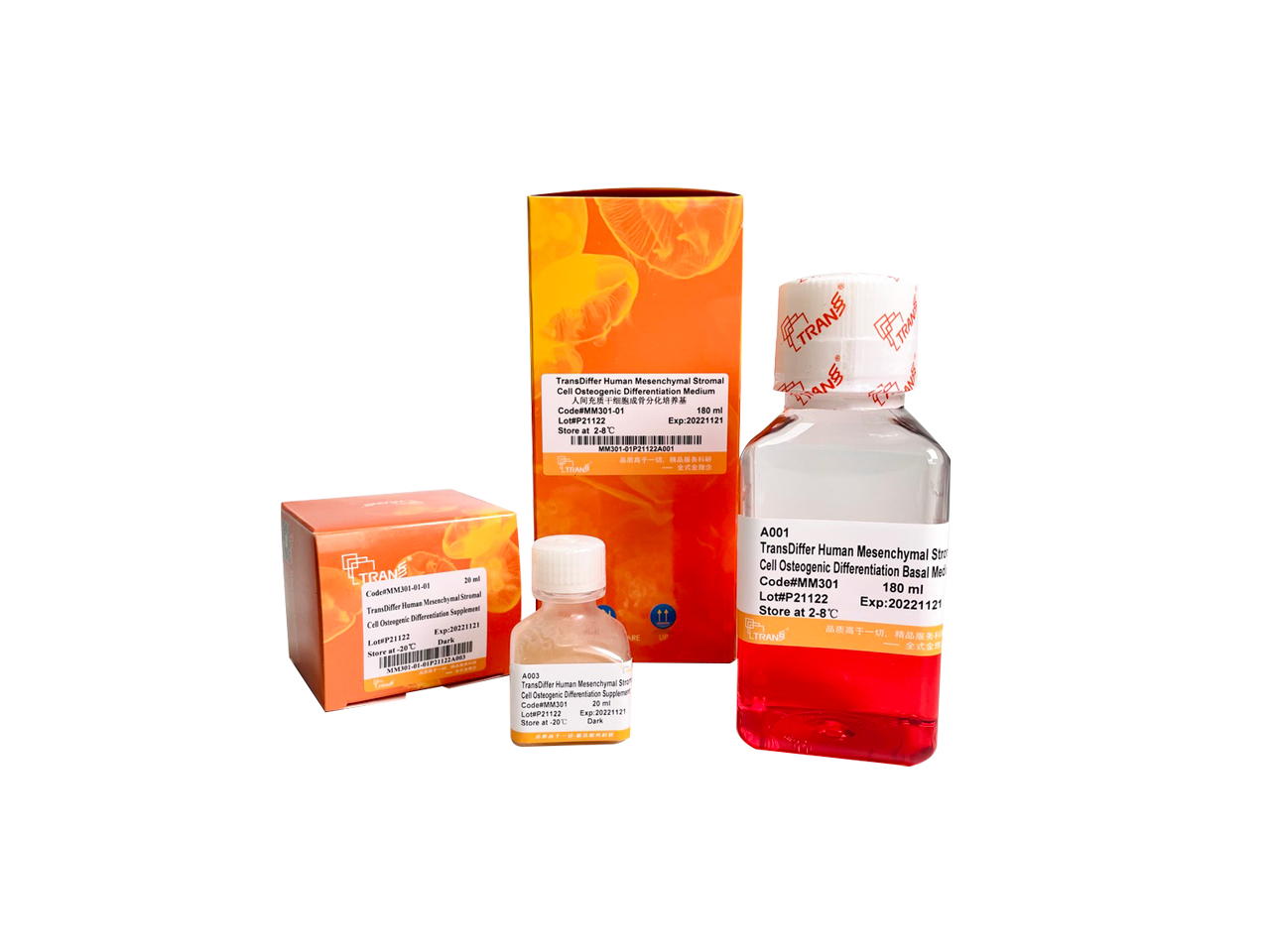 TransDiffer? Human Mesenchymal Stromal Cell Osteogenic Differentiation Medium是一種含血清的完全培養(yǎng)基,適用于將人間充質(zhì)干細胞(Human Mesenchymal Stromal Cells, MSCs)向成骨細胞分化。本試劑盒普適性強,適用于多種培養(yǎng)體系(含血清及無血清)培養(yǎng)的不同來源(人多能性干細胞衍生、骨髓、臍帶、脂肪來源)的MSCs。本產(chǎn)品穩(wěn)定性好,配制好的完全培養(yǎng)基可于2-8℃穩(wěn)定保存1個月。本產(chǎn)品分化效率高,可用于間充質(zhì)干細胞多向分化潛能鑒定中成骨分化的鑒定。