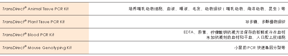 本試劑盒采用獨(dú)特的裂解緩沖液裂解組織(新鮮、凍存組織),所得裂解物無(wú)需純化即可作為模板,用抗抑制的2×TransDirect? PCR SuperMix(+dye) 進(jìn)行擴(kuò)增。擴(kuò)增產(chǎn)物可直接上樣電泳。AD3 Buffer建議分裝使用。