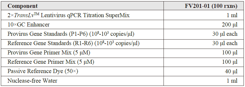 TransLvTM Lentivirus qPCR Titration Kit提供了一種利用qPCR方法檢測(cè)慢病毒轉(zhuǎn)導(dǎo)細(xì)胞中整合的前病毒序列拷貝數(shù)的方法。該方法簡(jiǎn)單快速、靈敏高效,兼容第二代和第三代HIV-1慢病毒包裝載體。慢病毒包裝后轉(zhuǎn)導(dǎo)易感細(xì)胞 (如HT1080,HEK-293T等),提取慢病毒轉(zhuǎn)導(dǎo)細(xì)胞基因組,進(jìn)行qPCR反應(yīng),通過(guò)標(biāo)準(zhǔn)曲線Ct值計(jì)算整合的前病毒拷貝數(shù),進(jìn)而得到確定的慢病毒滴度。